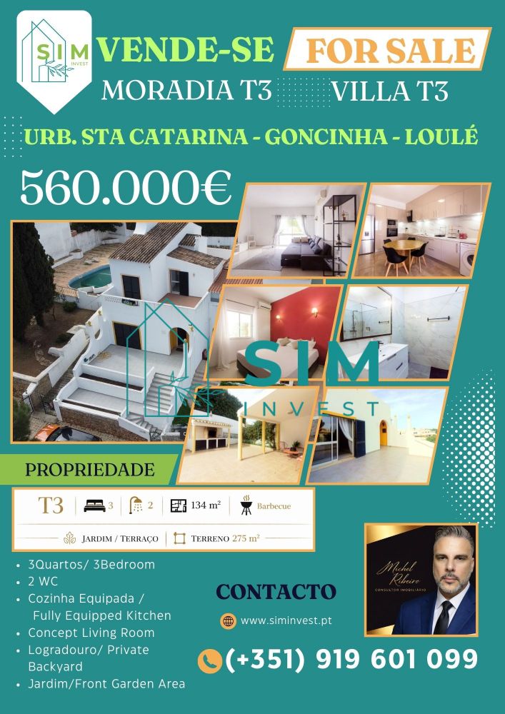Moradia T3 com Terraços e Vista Serra | Santa Catarina – Loulé Se procura uma moradia confortável, luminosa e pronta a habitar, numa zona tranquila mas com excelentes acessos, esta pode ser a escolha certa. Esta moradia T3, totalmente murada, combina funcionalidade, privacidade e qualidade de vida, inserida numa urbanização calma na zona de Santa Catarina, em Goncinha. Ao nível do rés-do-chão, destaca-se a sala de estar ampla, equipada com lareira e recuperador de calor, criando um ambiente acolhedor e ideal para momentos em família. Neste piso encontra ainda um quarto com roupeiro embutido e ar condicionado, uma cozinha moderna totalmente equipada com móveis lacados em tom champanhe e eletrodomésticos encastrados, bem como uma prática despensa que otimiza a organização do espaço. No primeiro piso, a zona privada oferece dois quartos, sendo um deles com roupeiro embutido de grandes dimensões, uma casa de banho completa e dois terraços — um frontal e outro posterior — que proporcionam excelente exposição solar e uma agradável vista para a serra. O conforto é assegurado durante todo o ano através de ar condicionado tipo split em todas as divisões principais. No exterior, o imóvel beneficia de jardins comuns bem cuidados, ideais para momentos de lazer, num ambiente seguro e resguardado. As portadas em alumínio reforçam a segurança e acrescentam um toque contemporâneo à fachada. Localização estratégica Situada numa zona residencial tranquila, com excelente proximidade aos principais pontos de interesse: Centro de Loulé – aproximadamente 5 minutos Faro – cerca de 15 minutos Aeroporto de Faro – cerca de 20 minutos Praias (Quarteira / Vilamoura) – aproximadamente 15 a 20 minutos Permite uma vivência prática no dia a dia, com acesso rápido a comércio, serviços e principais vias rodoviárias. Destaques do imóvel: Moradia T3 murada Lareira com recuperador de calor Ar condicionado em todas as divisões Cozinha totalmente equipada Despensa 2 terraços com vista serra Roupeiros embutidos Jardins comuns Zona calma com excelentes acessos Agende já a sua visita, Este tipo de oportunidade não costuma ficar disponível por muito tempo. Gestor do Imóvel: Michel Ribeiro